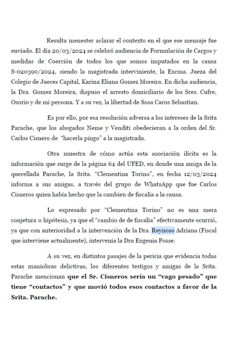 «Después, ponele, Cisneros ha hecho que lo muevan de fiscalía, no sé qué otra cosa, pero es como que está lleno de contactos y está ayudando en eso». Este es el mensaje de una amiga de la joven que denunció a los jugadores de Vélez, una pieza que se volvió determinante para que Adriana Reinoso Cuello, la fiscal de la causa, decidiera dar un paso al costado.