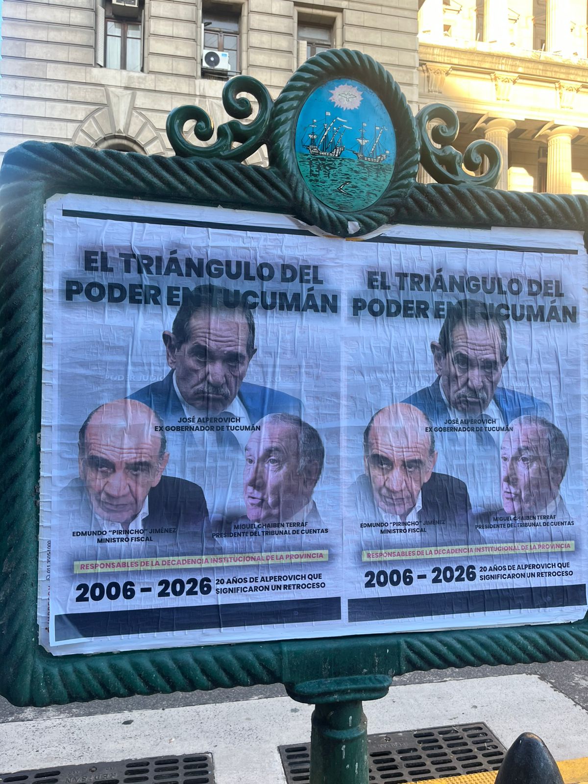 La desesperada ofensiva del diputado Carlos Cisneros contra el ministro fiscal Edmundo «Pirincho» Jiménez ha escalado hacia el ámbito nacional con dos movimientos estratégicos ejecutados esta semana en la Capital Federal. El primero consistió en una llamativa panfleteada frente al Palacio de Justicia de la calle Talcahuano, donde se desplegaron afiches que resucitan la teoría del «Triángulo del Poder en Tucumán» (foto), una narrativa que intenta presentar como una estructura de poder ilegítima la coordinación entre el exgobernador José Alperovich, el propio Jiménez y el presidente del Tribunal de Cuentas Miguel Terraf.