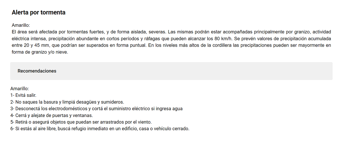 Las autoridades recomiendan a la población mantenerse informada a través de los canales oficiales, evitar la circulación innecesaria durante los eventos más intensos y tomar precauciones ante posibles ráfagas de viento, caída de granizo y acumulación rápida de agua en calles y rutas.