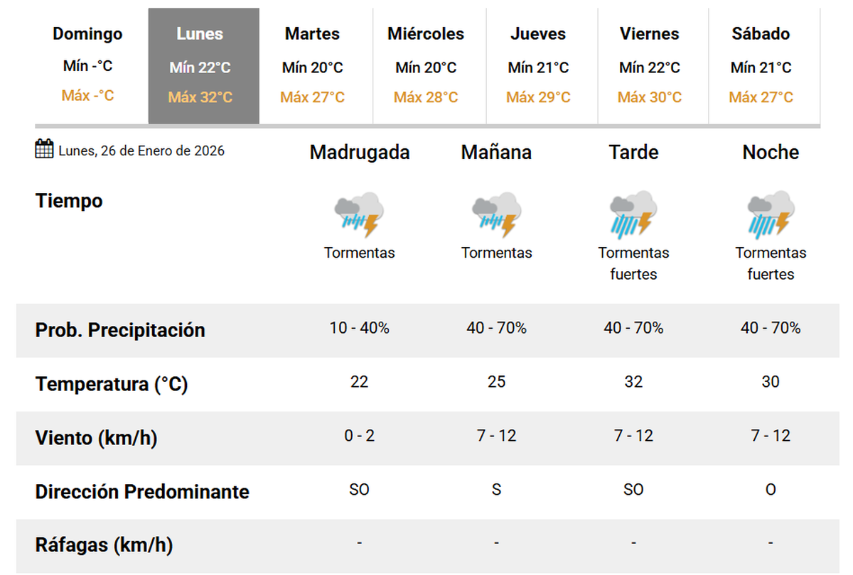 El Servicio Meteorológico Nacional (SMN) pronosticó para este lunes 26 de enero un día con probabilidad de tormentas durante toda la jornada, que se intensificarían hacia la tarde y la noche, en el marco de un alerta amarillo emitido para gran parte del territorio provincial.