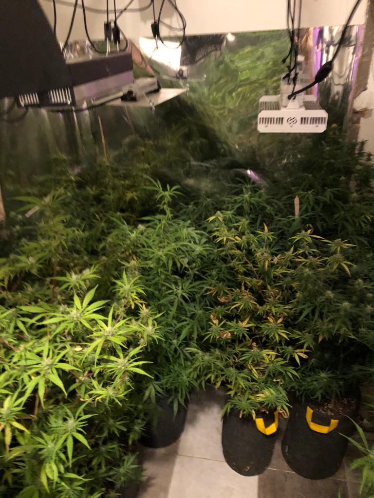 En ese domicilio los funcionarios encontraron una serie de elementos relacionados con un cultivo, detallados en el acta de secuestro: una habitación de dos metros por tres con paredes forradas en papel metalizado, siete lámparas LED de alta potencia, un farol de sodio con transformador, un filtro de aire de carbono, un equipo de aire acondicionado split y un termómetro digital, junto con 29 plantas de marihuana en plena floración. En una habitación contigua había cuatro germinadores con 25 plantines cada uno y seis plantines más sueltos, totalizando 106 plantines en etapa de crecimiento. En el lavadero del inmueble se secuestraron una prensa hidráulica con medidor de temperatura, una balanza digital marca SF-400, 38 frascos plásticos vacíos, 30 frascos transparentes adicionales, un paquete de bolsitas etiquetadas “Rosin Bas x 10” y 14 envoltorios con flores compactadas en tabletas de marihuana que sumaban 168 gramos. En el fondo del terreno se halló una carpa tipo invernadero con 21 plantas más en macetas, tres en tierra y tres colgadas secándose. La suma total de plantas secuestradas fue 162, con 303 gramos de flores cosechadas. También se detallaron fertilizantes profesionales, pulverizadores, coladores con restos de marihuana, tijeras de corte, espátulas con restos de aceite de cannabis y un sistema de ventilación con filtros de carbono.