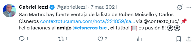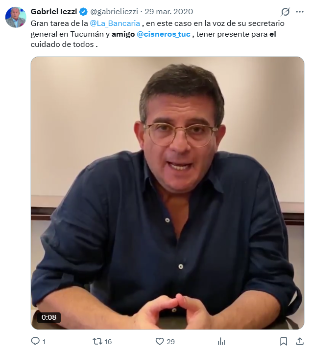 Su vínculo con Carlos Cisneros –histórico dirigente de La Bancaria y exreferente de la Caja Popular durante tres décadas– es público y de larga data. En publicaciones de su cuenta de X (@gabrieliezzi), Iezzi se refiere a Cisneros como “el amigo @cisneros_tuc” y ha respaldado sus listas políticas y deportivas en San Martín de Tucumán.