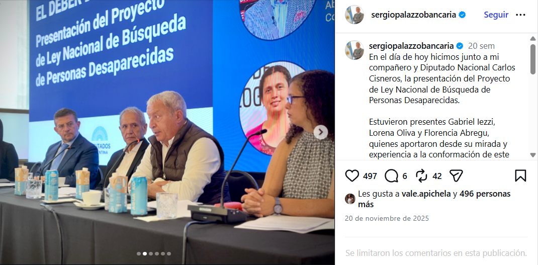 En noviembre de 2025, aparecieron juntos en publicaciones de Instagram –incluidas en el perfil de Sergio Palazzo y La Bancaria– durante la presentación del Proyecto de Ley Nacional “El Deber de Buscar”, destinado a la búsqueda de personas desaparecidas. Esta práctica de disfrazar de buenas intenciones humanitarias o igualitarias para esconder detrás oscuros negocios es una práctica que los tucumanos hemos conocido en demasiadas oportunidades.