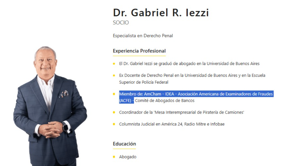 Este mediático hombre de leyes, que disfruta de resaltar su amistad con Cisneros a través de las redes o de felicitar al expresidente de San Martín, Rubén Moisello –formalmente responsable de su contratación– cuando ganó las elecciones, es penalista con sede en Buenos Aires y cuenta con más de 35 años de trayectoria. Además, es socio fundador del estudio Iezzi y Barone, el mismo que “se olvidó” de responder la demanda. Graduado en la Universidad de Buenos Aires, exdocente de Derecho Penal en esa casa de estudios y en la Escuela Superior de Policía Federal, se especializa en derecho penal empresarial y defensa de compañías en causas complejas.