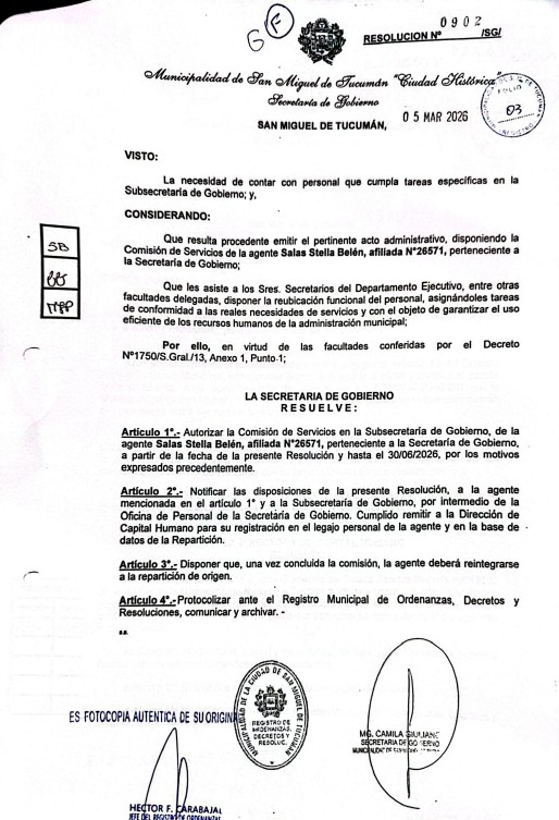 Fuentes judiciales consultadas por este medio aseguraron que desde la Municipalidad de San Miguel de Tucumán se busca deliberadamente mantener un alto perfil periodístico de la causa para afectar la imagen del funcionario provincial. En ese sentido, resulta revelador que la abogada Stella Belén Salas —representante legal de la parte querellante en este expediente— haya sido designada hace poco más de un mes en la administración municipal (ver abajo). La Resolución N° 0902/SGI de la Secretaría de Gobierno, fechada el 5 de marzo de 2026, la comisionó en la Subsecretaría de Gobierno “hasta el 30/06/2026” para cumplir “tareas específicas”, en un movimiento que coincide temporalmente con la mayor actividad mediática del caso.