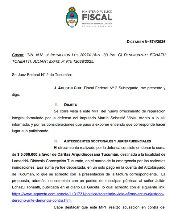 En el dictamen N° 574/2026, de fecha 13 de abril de 2026, el representante del Ministerio Público Fiscal consideró que la oferta de Viola —consistente en la donación de $5.000.000 a Cáritas Arquidiocesana Tucumán, destinada a las víctimas de las inundaciones en Lamadrid, y el pedido de disculpas públicas publicado en La Gaceta y en su cuenta de la red social X— resulta “proporcional y suficiente”. Chit revocó así su posición anterior, cuando había calificado de insuficiente un primer ofrecimiento de $3.000.000, y solicitó al juez federal Guillermo Díaz Martínez que homologue el acuerdo, declare la extinción de la acción penal y dicte el sobreseimiento de Viola una vez vencido el plazo de tres días otorgado al damnificado Julián Echazú Toneatti para eventual oposición.